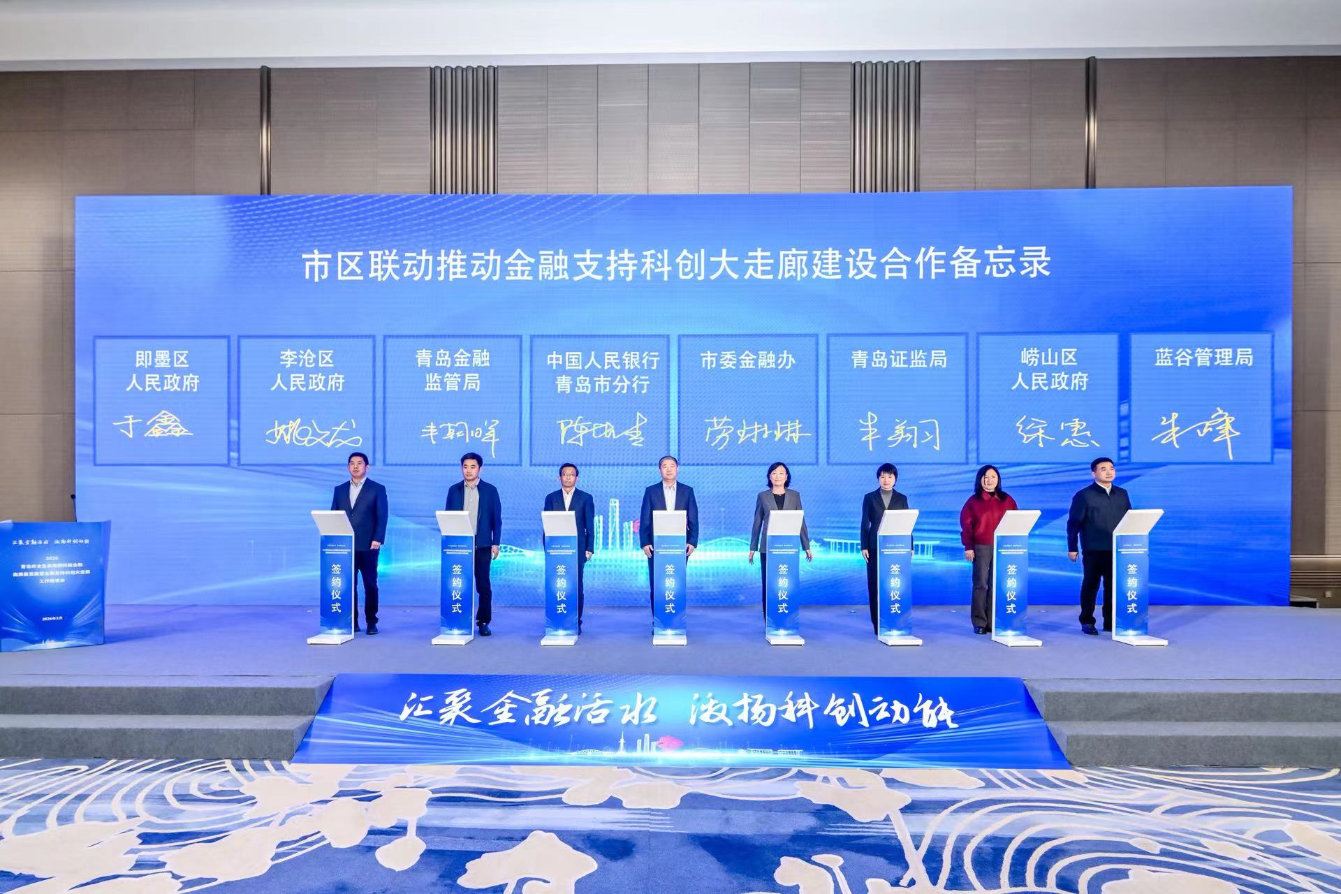 在簽約儀式環(huán)節(jié),人民銀行青島市分行、青島市委金融辦、青島金融監(jiān)管局、青島證監(jiān)局、李滄區(qū)、嶗山區(qū)、即墨區(qū)、青島藍(lán)谷管理局聯(lián)合簽署《市區(qū)聯(lián)動(dòng)推動(dòng)金融支持科創(chuàng)大走廊建設(shè)合作備忘錄》,人民銀行青島市分行、即墨區(qū)、青島藍(lán)谷管理局共同簽署《海洋科技城金融服務(wù)合作協(xié)議暨推動(dòng)即墨區(qū)經(jīng)濟(jì)金融高質(zhì)量發(fā)展合作備忘錄》,加強(qiáng)市、區(qū)(市)兩級(jí)溝通協(xié)作,共同為科創(chuàng)大走廊、海洋科技等重大城市戰(zhàn)略、重點(diǎn)領(lǐng)域賦能。