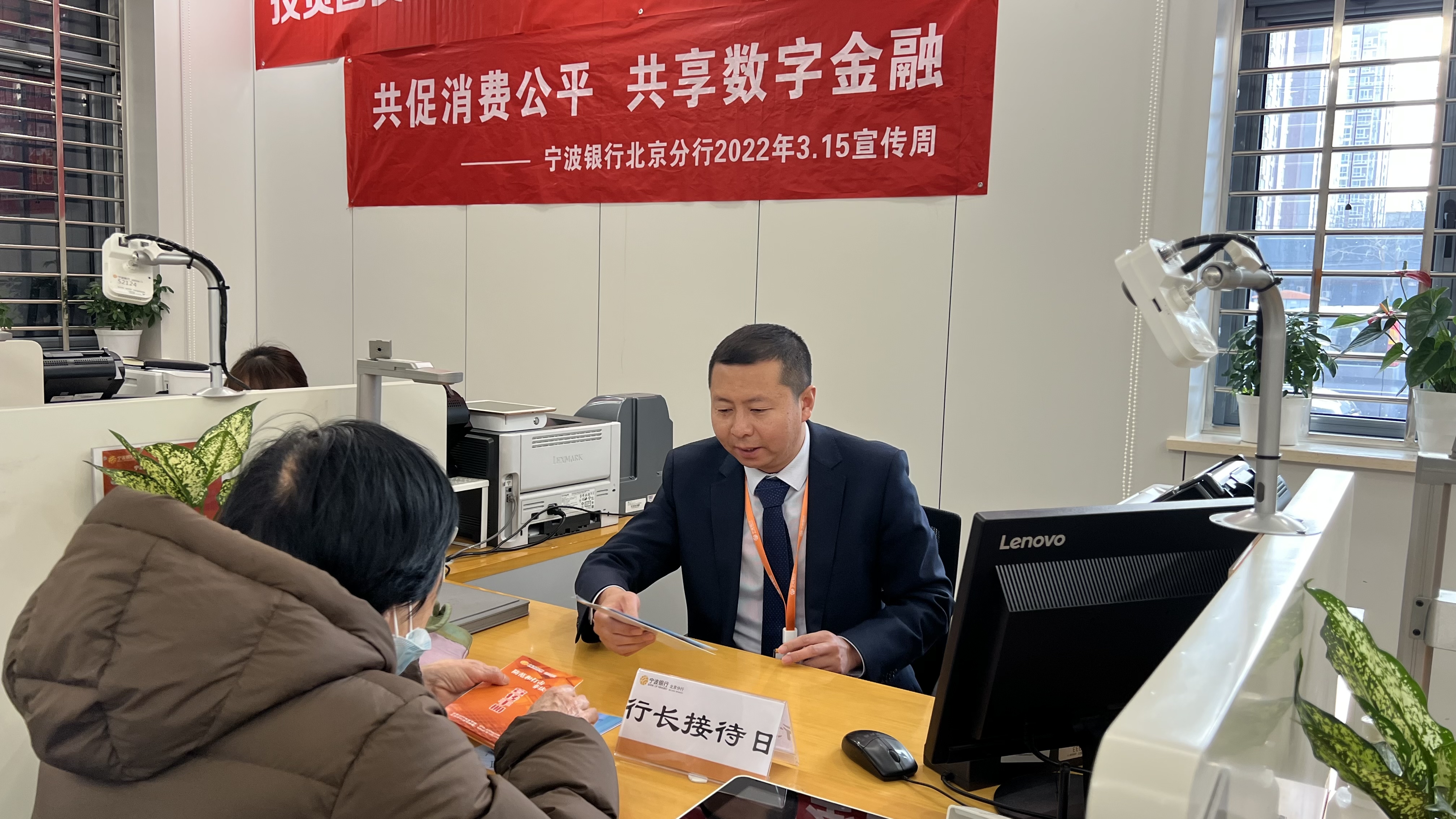 “行長接待日”是寧波銀行北京分行金融知識普及宣傳活動的一大特色,他們調動中層管理人員參與金融知識普及宣傳的熱情,給消費者良好的服務體驗。今年3月15日當天17家網(wǎng)點的行長室成員走進廳堂,接待來行客戶,主動向客戶遞送“3·15”消費者權益日活動宣傳折頁,宣傳“權利責任風險”和“共促消費公平共享數(shù)字金融”活動主題,解答客戶關于防范金融風險方面的疑問,講解防范電信詐騙、金融投資方面的風險提示。特別提醒60歲以上老年客戶注意防范資金風險,謹慎操作電子產(chǎn)品。他們主動走近客戶開展咨詢及滿意度調查,收集客戶對于產(chǎn)品及服務的意見與建議。受到前來辦理業(yè)務的消費者一致好評,紛紛為行長們的專業(yè)和敬業(yè)點贊。