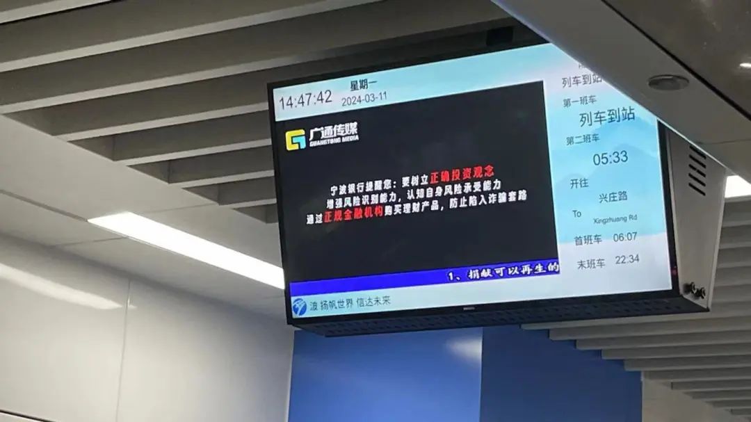 “熟人作保沒風(fēng)險,保本短期賺翻天?高息詐騙隨處見,錢財不久全被騙!”這是寧波銀行在一個金融知識短視頻中的風(fēng)險提示,該視頻通過講述一位受害人陷入高息詐騙的投資陷阱,提醒消費(fèi)者要樹立正確的投資觀念,增強(qiáng)風(fēng)險識別能力,要通過正規(guī)金融機(jī)構(gòu)購買理財產(chǎn)品。目前該視頻已在寧波市5條地鐵線路和市區(qū)所有公交線路共10730個移動視頻終端進(jìn)行展播,并將連續(xù)播放3個月。