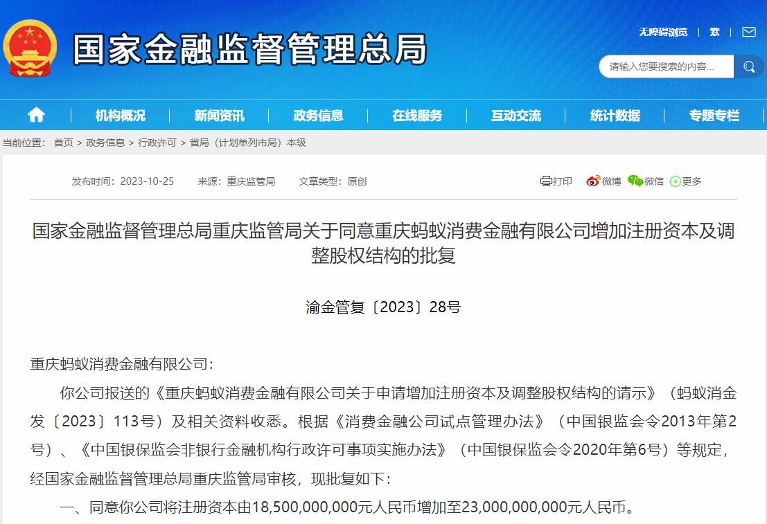 10月25日,根據(jù)國家金融監(jiān)督管理總局官網(wǎng),經(jīng)國家金融監(jiān)督管理總局重慶監(jiān)管局審核批復,同意重慶螞蟻消費金融有限公司(下稱:螞蟻消金)將注冊資本由185億元人民幣增加至230億元人民幣。此次增加注冊資本并調(diào)整股權(quán)結(jié)構(gòu)后,螞蟻消金股東達13家。