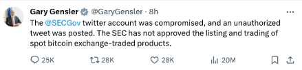 此次重大消息一出,幣圈市場立馬沉浸在一片快樂喜悅的氛圍之中。但很快,SEC主席GaryGensler在其個人的X賬號上發(fā)帖稱,SEC的官方賬號遭受到黑客攻擊,發(fā)布了未經(jīng)授權(quán)的帖子,SEC并沒有批準比特幣現(xiàn)貨ETF上市和交易。隨后,SEC的官方賬號也發(fā)布了同樣的聲明,并刪除了此前的帖子。這段時間內(nèi),比特幣大幅波動逾3000美元,全網(wǎng)加密貨幣在一小時內(nèi)超4000萬美元資金爆倉。