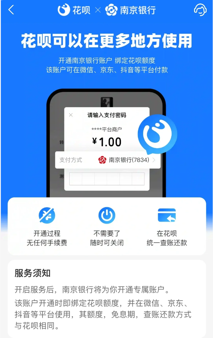 據(jù)了解,在花唄里開通一張南京銀行花唄額度專屬銀行卡后,使用該張銀行卡可使用花唄額度進行消費。目前該服務(wù)已支持綁定微信、抖音、京東等支付平臺。