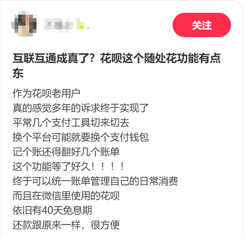 已體驗的網(wǎng)友在“小紅書”曬出截圖顯示:“在微信支付里選擇這張卡支付,依舊有花唄40天免息期,還款跟原來一樣,很方便”“多年的訴求終于實現(xiàn)了,終于可以統(tǒng)一賬單管理自己的日常消費。”