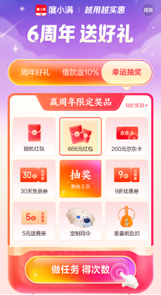 除了上述好禮之外,為進(jìn)一步感恩用戶六年來(lái)的支持與陪伴,度小滿還推出幸運(yùn)抽獎(jiǎng)活動(dòng),100%中獎(jiǎng)。其獎(jiǎng)品包括666元現(xiàn)金紅包、30天免息券、200元京東卡等。用戶完成相關(guān)任務(wù),還可解鎖更多次抽獎(jiǎng)機(jī)會(huì)。