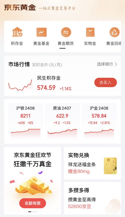 為滿足多元化黃金投資者訴求,京東金融推出了“京東黃金”頻道,是涵蓋積存金(可兌換實(shí)物)、黃金ETF聯(lián)接基金、黃金股基金以及黃金回收等多種投資工具的一站式黃金投資理財(cái)平臺(tái),吸引了大量用戶關(guān)注和參與。其中,京東金融的積存金服務(wù)憑借5x24小時(shí)交易、T+0模式和日日生息等差異化特性,得到了大量用戶的青睞。