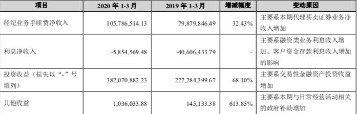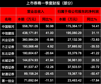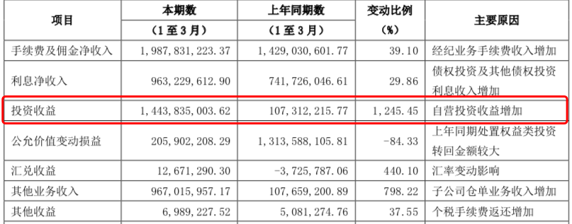 中國(guó)銀河一季度實(shí)現(xiàn)營(yíng)業(yè)收入55.88億元,同比增長(zhǎng)50.98%;實(shí)現(xiàn)歸屬于上市公司股東的凈利潤(rùn)17.54億元,同比增長(zhǎng)14.41%。其中,中國(guó)銀河的投資收益同比大增1245.45%,主要因?yàn)樽誀I(yíng)投資收益增加。