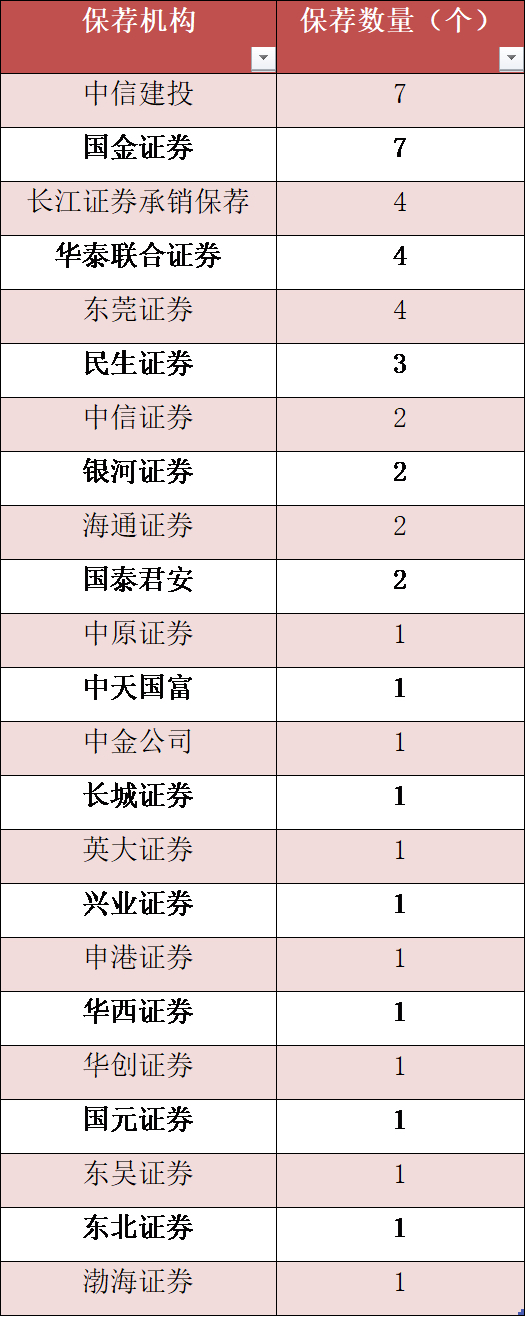 具體來看,中信建投、國金證券保薦的企業(yè)數(shù)量最多,均以7家企業(yè)拔得頭籌。長江證券承銷保薦、東莞證券、華泰聯(lián)合證券并列第二,分別保薦了4家企業(yè)。