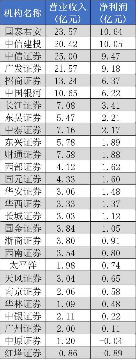 凈利潤前十排行榜單為:中信證券、中信建投證券、國泰君安、廣發(fā)證券、招商證券、中國銀河證券、長江證券、國金證券、東興證券和華西證券。