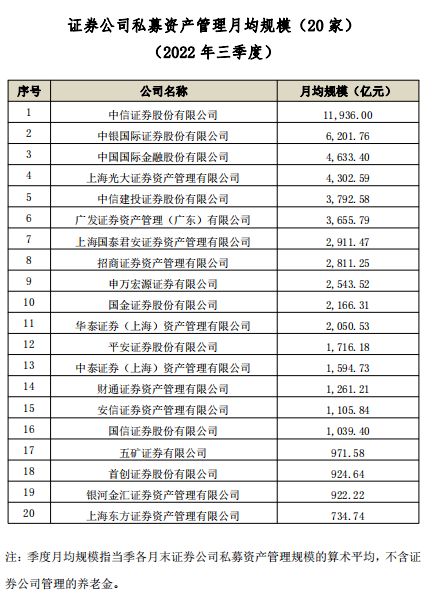 11月14日晚間,中國證券投資基金業(yè)協(xié)會(huì)發(fā)布三季度證券公司私募資產(chǎn)管理月均規(guī)模數(shù)據(jù),據(jù)《證券日?qǐng)?bào)》記者梳理,前20強(qiáng)月均規(guī)模合計(jì)為5.73萬億元,環(huán)比增長1.21%。