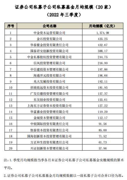同時(shí),三季度,證券公司私募子公司私募基金月均規(guī)模前20強(qiáng)也出爐。中金資本持續(xù)以1374.98億元的月均規(guī)模遙遙領(lǐng)先;金石投資與華泰紫金投資之間競爭較大,三季度,金石投資超越華泰紫金投資位列第二,月均規(guī)模為435.25億元;華泰紫金投資為432.67億元。