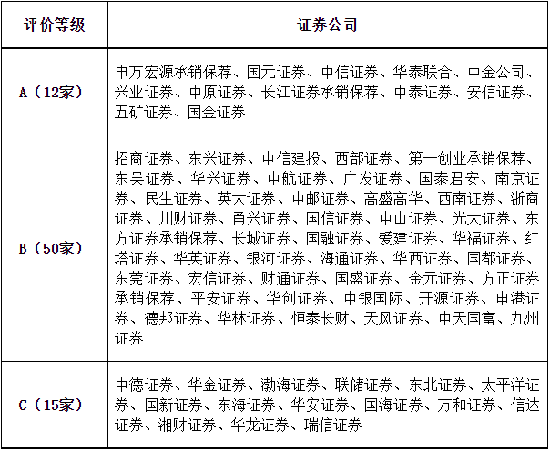 據(jù)中證協(xié)官網(wǎng)消息,12月9日,中證協(xié)發(fā)布2022年證券公司投行業(yè)務(wù)質(zhì)量評價結(jié)果的公告,12家公司被評為A類,50家公司被評為B類,15家公司被評為C類。