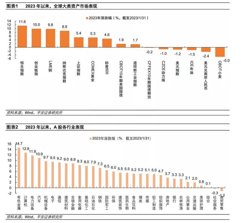 市場的短期邏輯得到了較好的印證和兌現(xiàn)。具體分析來看,第一,長期以來制約市場和經(jīng)濟的疫情因素大幅緩解。2023年疫情將不再成為市場的核心要素,相反疫情之后經(jīng)濟發(fā)展的動能何在,政府、企業(yè)、個人對于經(jīng)濟發(fā)展的訴求將逐漸成為市場的主要關(guān)注點;第二,經(jīng)濟在復蘇期有利于權(quán)益資產(chǎn)的格局不變。在確認了2022年四季度(受疫情影響)較低的增速之后(投資、消費、進出口全方位的滑落),2023年一季度中國經(jīng)濟正式進入修復及復蘇階段,這不僅僅是預期先行,也是海內(nèi)外的共識(關(guān)系到海外資金的持續(xù)流入);第三,結(jié)構(gòu)上出行消費、服務(wù)消費先行,投資、制造等領(lǐng)域也將加快投入力度。1月份及春節(jié)期間市場關(guān)注的高頻數(shù)據(jù),包括旅游、影視、出行等方面數(shù)據(jù)給予了市場一定的信心,平安證券判斷后續(xù)在制造業(yè)、投資等數(shù)據(jù)上也會出現(xiàn)好的變化。