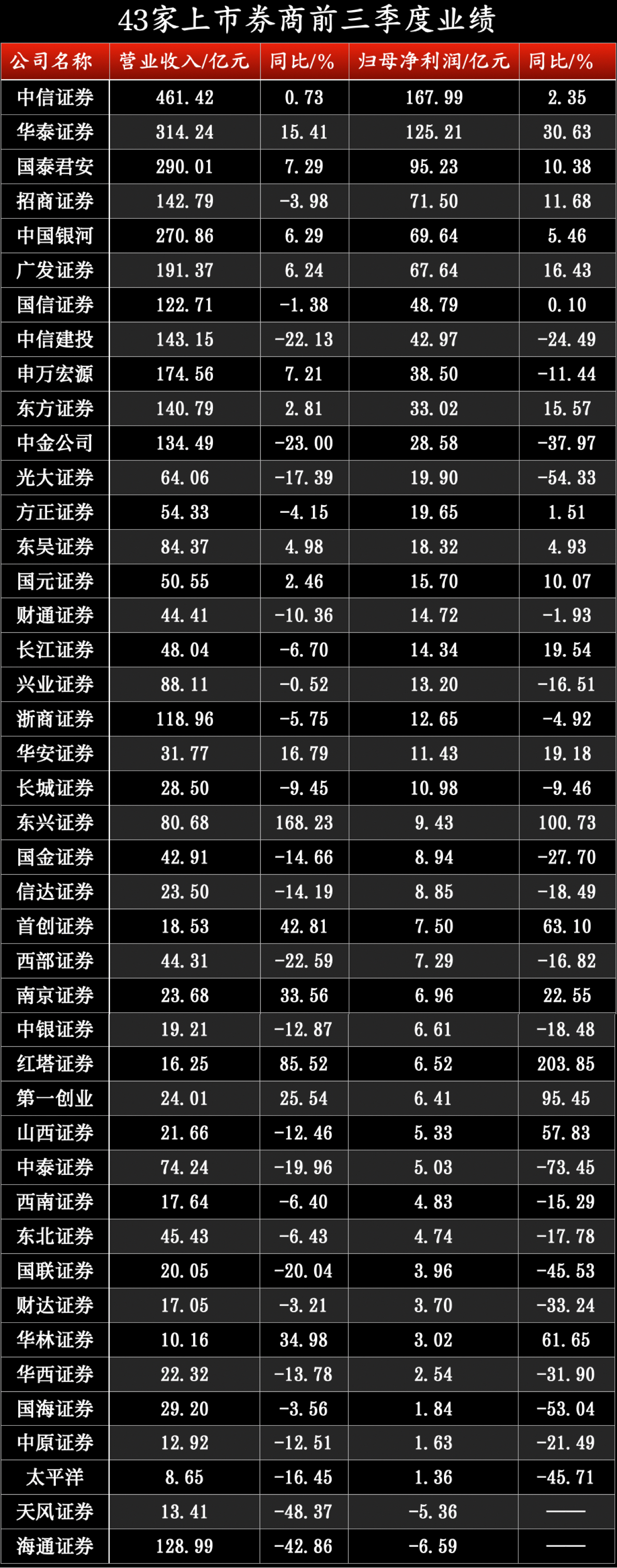 值得關(guān)注的是,43家上市券商中,中信證券、華泰證券兩家頭部公司前三季度歸母凈利潤(rùn)均超百億元,中信證券拿下券商營(yíng)收、歸母凈利潤(rùn)“雙料王”。頭部券商中,中信證券、華泰證券、國(guó)泰君安、中國(guó)銀河、廣發(fā)證券均實(shí)現(xiàn)營(yíng)業(yè)收入及歸母凈利潤(rùn)同比雙增長(zhǎng)。