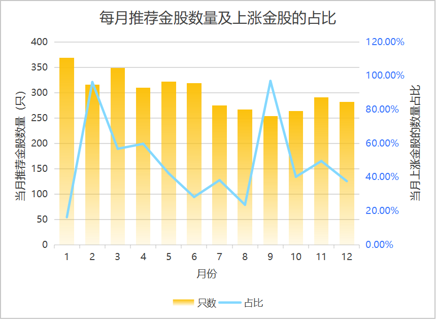 2024年每月券商推薦金股數(shù)量及當月上漲金股占比 制圖/周尚伃于宏