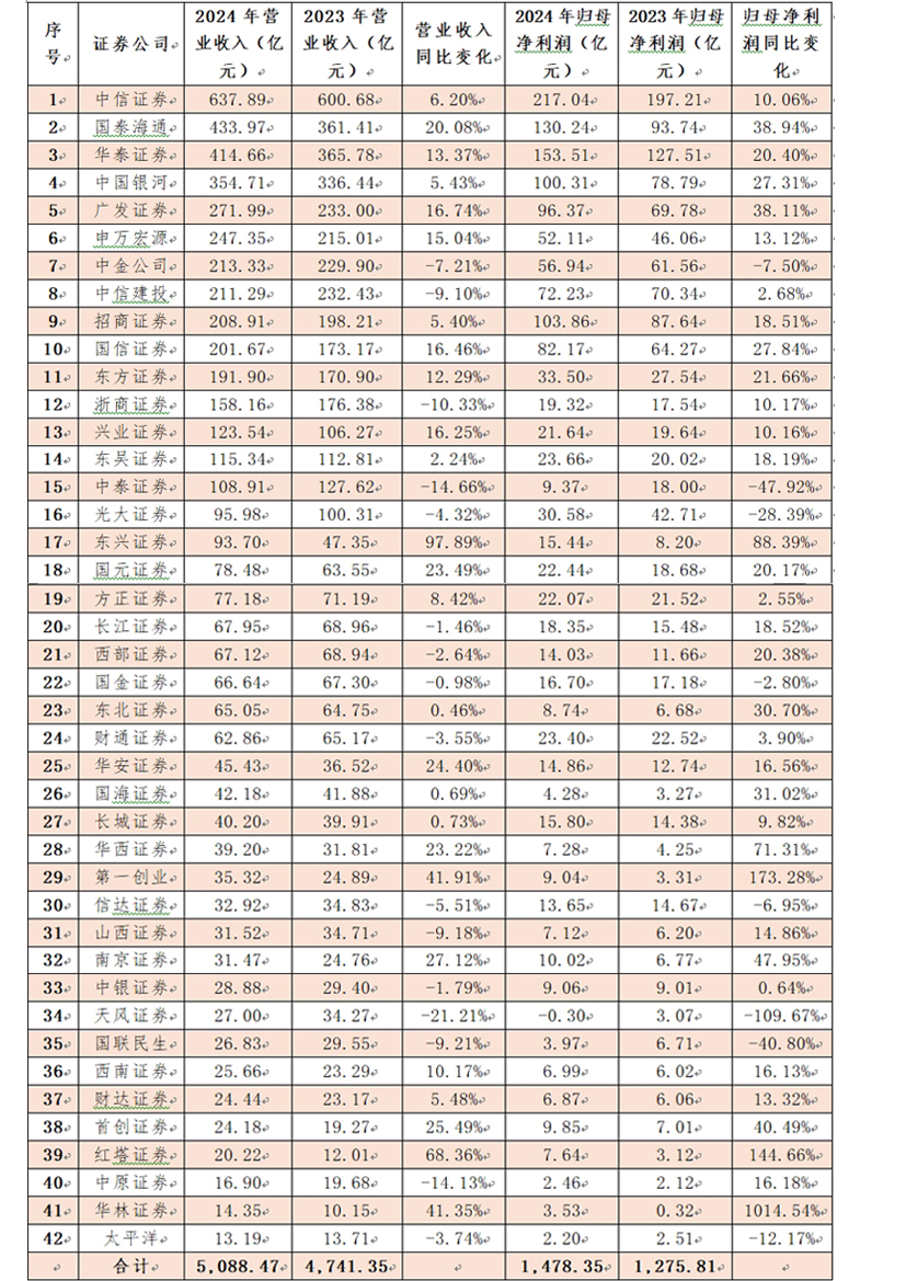 上市券商近期陸續(xù)公布2024年年報(bào),42家上市券商2024年共實(shí)現(xiàn)營業(yè)收入5,088.47億元,較2023年同比增長7.32%;實(shí)現(xiàn)歸母凈利潤1,478.35億元,較2023年同比增長15.88%。2024年上市券商營業(yè)收入及歸母凈利潤總規(guī)模實(shí)現(xiàn)“雙增”,上市券商中有26家營業(yè)收入同比實(shí)現(xiàn)正增長,34家歸母凈利潤同比實(shí)現(xiàn)正增長。