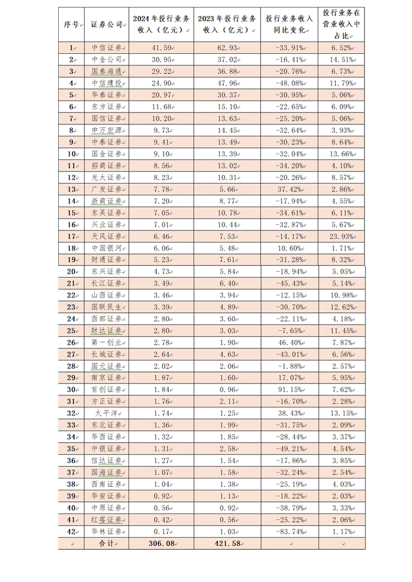 受行業(yè)周期影響,上市券商投行業(yè)務(wù)仍未走出低迷。根據(jù)年報(bào)數(shù)據(jù),42家上市券商2024年投資銀行業(yè)務(wù)共實(shí)現(xiàn)手續(xù)費(fèi)凈收入306.08億元,較2023年的421.58億元,下降27.40%,行業(yè)同比變化中位數(shù)是-25.19%,這反映出投行業(yè)務(wù)收入下滑已經(jīng)成為行業(yè)普遍現(xiàn)象。上市券商中,首創(chuàng)證券、第一創(chuàng)業(yè)證券、太平洋證券、廣發(fā)證券、南京證券、中國銀河證券等6家投行業(yè)務(wù)收入實(shí)現(xiàn)正增長,占比僅為14.29%。國元證券、財(cái)達(dá)證券等投行業(yè)務(wù)收入保持穩(wěn)定,而多數(shù)券商投行業(yè)務(wù)則出現(xiàn)較大幅度的下滑。從年報(bào)數(shù)據(jù)還能看出,投行業(yè)務(wù)收入在上市券商整體收入規(guī)模中占比不高,僅有中金公司、中信建投、國金證券、天風(fēng)證券、山西證券、財(cái)達(dá)證券、太平洋證券等少數(shù)上市券商投行收入在營業(yè)收入中占比超10%。