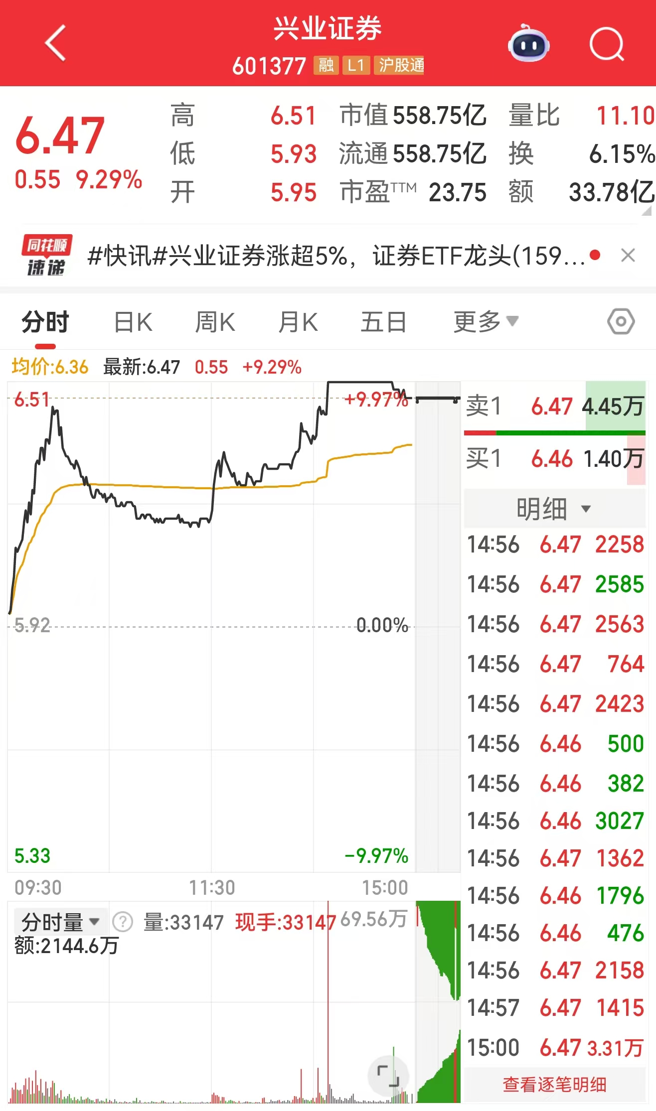 6月11日,興業(yè)證券大漲,午后一度漲停,收盤最終上漲9.29%,領(lǐng)漲券商板塊。