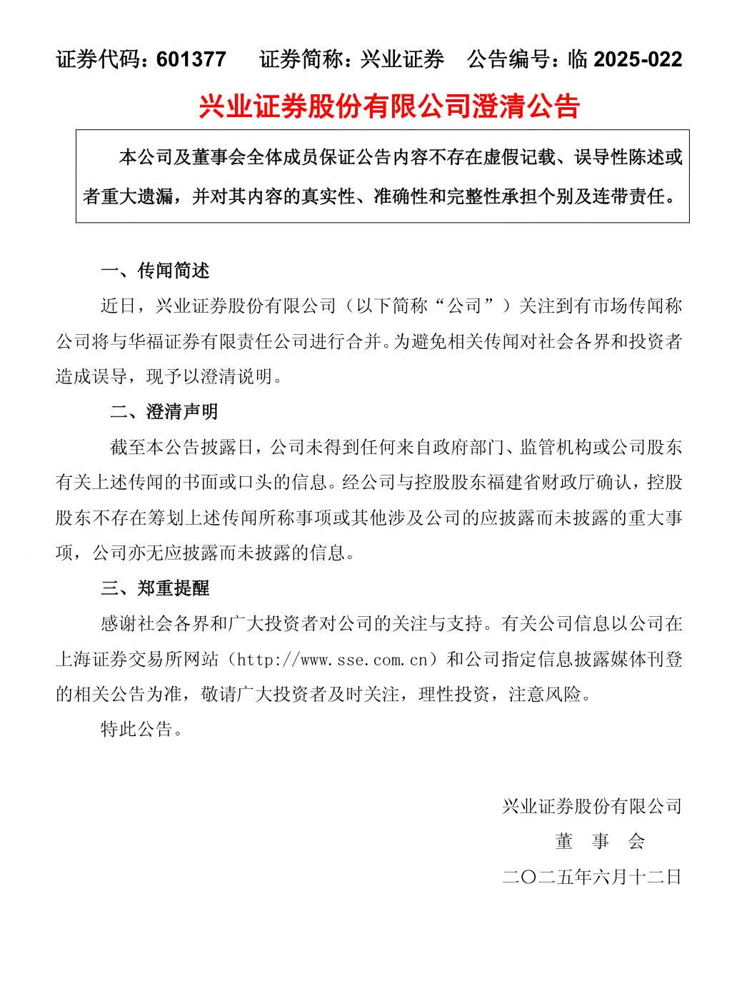 6月11日晚間,興業(yè)證券(601377.SH)發(fā)布公告稱,近日,公司關(guān)注到有市場傳聞稱公司將與華福證券進行合并。為避免相關(guān)傳聞對社會各界和投資者造成誤導(dǎo),現(xiàn)予以澄清說明。