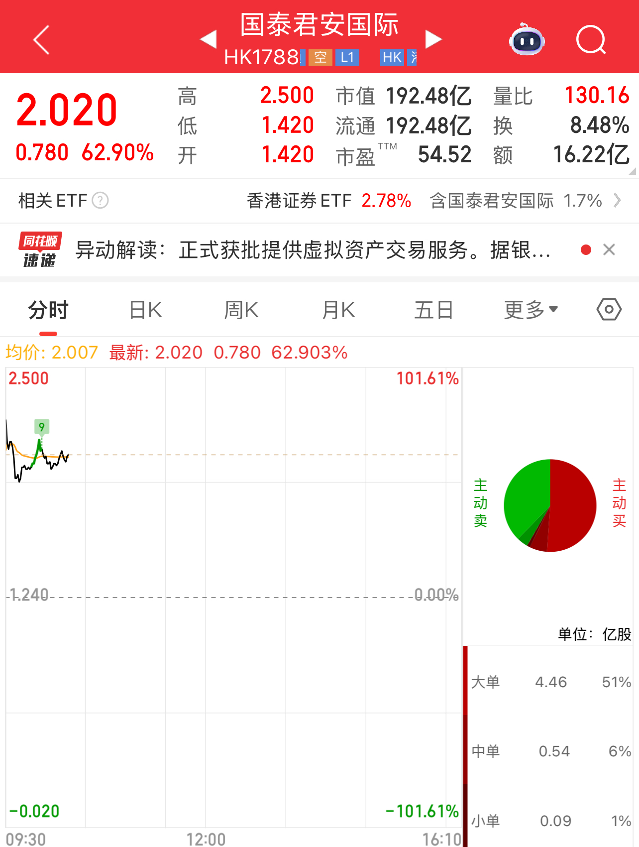同時(shí),港股中資券商股板塊同樣表現(xiàn)活躍,截至記者發(fā)稿時(shí),板塊漲幅突破8%。國(guó)泰君安國(guó)際股價(jià)今日盤(pán)中最高漲幅觸及101.61%,截至發(fā)稿時(shí),該股股價(jià)漲幅超60%。