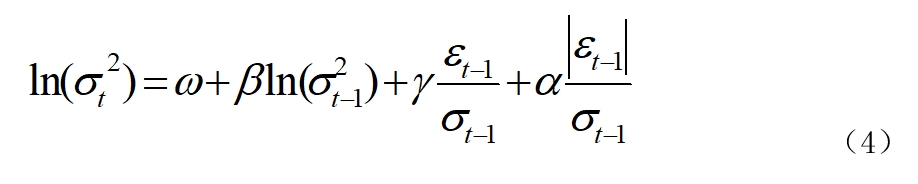 上式為EGARCH模型的一般表達(dá)式,其中β為波動(dòng)率的持續(xù)性參數(shù),反映過(guò)去波動(dòng)率對(duì)當(dāng)前波動(dòng)率的影響程度;γ為杠桿效應(yīng)參數(shù),用于衡量沖擊方向(正或負(fù))對(duì)波動(dòng)率的影響差異,當(dāng)γ<0時(shí),反映了波動(dòng)率在資產(chǎn)價(jià)格下降時(shí)帶來(lái)的影響大于資產(chǎn)價(jià)格上升相同幅度時(shí)帶來(lái)的影響;α為波動(dòng)率沖擊參數(shù),用于衡量標(biāo)準(zhǔn)化殘差絕對(duì)值對(duì)波動(dòng)率的影響。