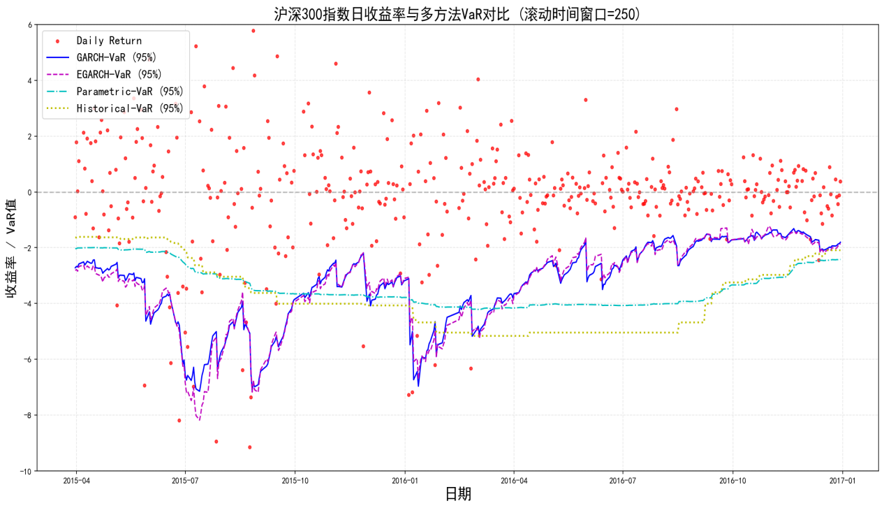 從以上計(jì)量結(jié)果可以看出,在市場(chǎng)劇烈波動(dòng)的時(shí)期(2015-2016),滬深300指數(shù)波動(dòng)率處于較高水平,波動(dòng)聚集和杠桿效應(yīng)顯著增強(qiáng),該時(shí)間段內(nèi)的GARCH類(lèi)模型在VaR的計(jì)量上顯示出較為明顯的優(yōu)勢(shì),一是在市場(chǎng)出現(xiàn)單日大幅下跌時(shí),GARCH類(lèi)模型能夠依靠條件方差快速提升VaR值,更及時(shí)地反映潛在風(fēng)險(xiǎn);二是回溯測(cè)試的突破次數(shù)更接近理論值,即5%;三是EGARCH模型擅長(zhǎng)捕捉負(fù)收益沖擊帶來(lái)的波動(dòng)率變化,相比GARCH模型,使VaR對(duì)市場(chǎng)下行風(fēng)險(xiǎn)更加敏感,更適用于尾部風(fēng)險(xiǎn)顯著的市場(chǎng);四是在小幅波動(dòng)聚集時(shí)期,GARCH類(lèi)模型能夠更快地降低VaR值,使得VaR值不被持續(xù)高估,風(fēng)險(xiǎn)計(jì)量更能貼近市場(chǎng)真實(shí)值。