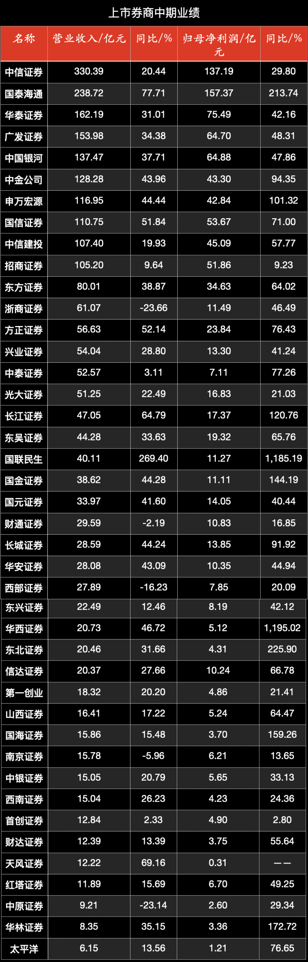 深入分析上半年業(yè)績情況,在42家上市券商中,有37家券商的營業(yè)收入和歸母凈利潤均實現(xiàn)了同比正增長,呈現(xiàn)出“雙增長”的良好局面;中信證券、國泰海通、華泰證券、廣發(fā)證券、中國銀河、中金公司、申萬宏源、國信證券、中信建投、招商證券等十大頭部券商的營業(yè)收入全部超百億元,中信證券、國泰海通兩家公司的歸母凈利潤均超百億元。另外,還有1家上市券商成功扭轉(zhuǎn)虧損局面,實現(xiàn)了歸母凈利潤的扭虧為盈,基本面的修復(fù)為行業(yè)整體盈利水平提升注入了增量。