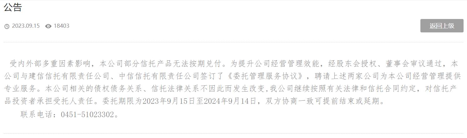 “本公司相關的債權債務關系、信托法律關系不因此而發(fā)生改變,我公司繼續(xù)按照有關法律和信托合同約定,對信托產品投資者承擔受托人責任。委托期限為2023年9月15日至2024年9月14日,雙方協(xié)商一致可提前結束或延期。”中融信托公告顯示。