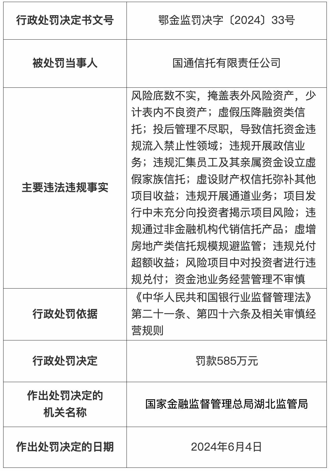 本報訊 (記者張安)6月14日,國家金融監(jiān)督管理總局湖北監(jiān)管局發(fā)布22張罰單,國通信托因13項違法違規(guī)事實被處罰款585萬元。同時,21名相關(guān)責任人被處罰,其中18名責任人被處警告,時任國通信托副總裁曹陽等3名責任人被處警告并罰款合計46萬元。