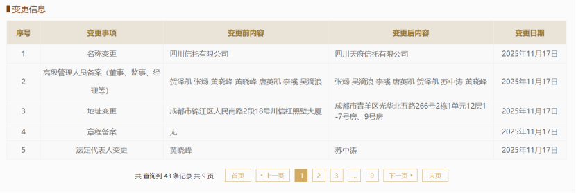 本報(bào)訊 (記者方凌晨)11月17日,國家企業(yè)信用信息公示系統(tǒng)顯示,“四川信托有限公司”更名為“四川天府信托有限公司”,同時(shí)高級管理人員備案(董事、監(jiān)事、經(jīng)理等)、地址信息、公司章程、法定代表人等多個(gè)事項(xiàng)發(fā)生變更。