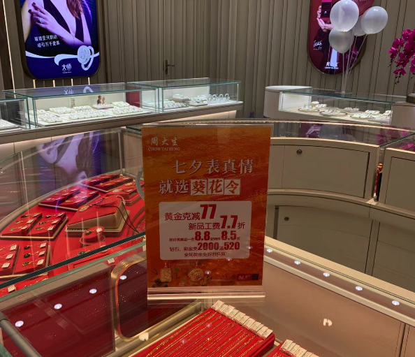 “現(xiàn)在我們的七夕活動已經(jīng)開始了,店里的足金飾品都有折扣,按克售賣的飾品每克減77元,按件售賣的彩金類也享受8.8折,還有不少其他的優(yōu)惠都能疊加。”8月1日,《證券日報》記者以消費者身份走訪北京一家周大生金店時,銷售人員對各類金飾產(chǎn)品進行了熱情的介紹。銷售人員表示,7月份以來金價有所下跌,加之臨近七夕節(jié),最近來選購金飾的顧客明顯增多。