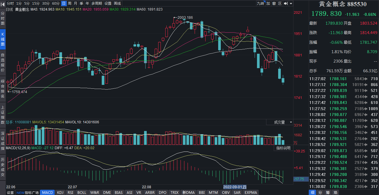 受到國際金價(jià)大幅下挫影響,近期A股黃金概念板塊指數(shù)也顯現(xiàn)弱勢。自9月份以來,截至9月26日,黃金概念指數(shù)期間已經(jīng)累計(jì)下跌4.92%,期間上證指數(shù)累計(jì)下跌4.71%。9月27日,截至11:30,黃金概念指數(shù)則下跌0.66%。