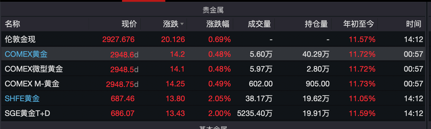 Wind資訊數(shù)據(jù)顯示,北京時(shí)間2月11日14點(diǎn)12分,倫敦金現(xiàn)報(bào)2927.676美元/盎司,COMEX黃金報(bào)2948.6美元/盎司,SHFE黃金報(bào)687.46元/克。