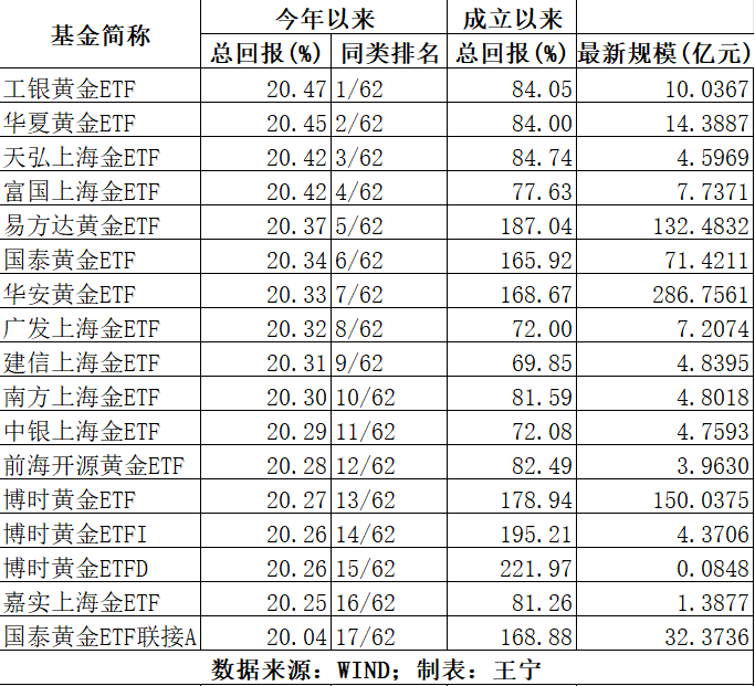 數(shù)據(jù)顯示,62只商品型基金中年內業(yè)績表現(xiàn)較好的均為黃金主題產品,例如華夏黃金ETF、天弘上海金ETF、國泰黃金ETF、南方上海金ETF和嘉實上海金ETF等17只產品,收益率均超過20%;同時,另有35只黃金聯(lián)接基金年內收益也都保持在18%—20%之間。此外,多只豆粕和白銀等主題基金也都實現(xiàn)了正收益。