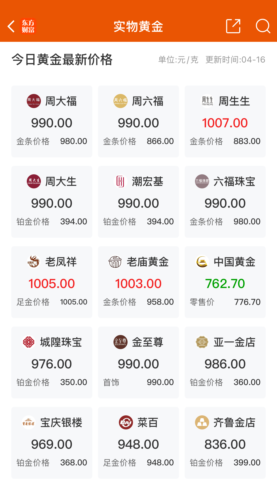 金飾方面,面對金價上漲不同品牌調(diào)價表現(xiàn)不一,如周生生黃金價格已調(diào)至1007元/克;而菜百、周大福等黃金價格則保持不變,4月15日菜百報價948元/克,周大福報價990元/克。
