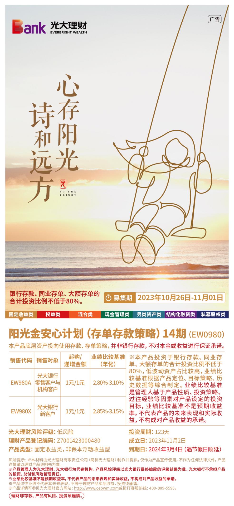 據(jù)光大理財介紹,該系列產(chǎn)品期限覆蓋3個月至1年,今年以來平均年化收益率3.11%(數(shù)據(jù)來源:光大理財,截至2023年9月28日)。