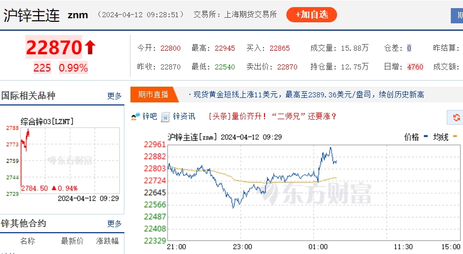 早盤國內(nèi)鋅價接近23000點大關(guān)(供圖:東方財富)
