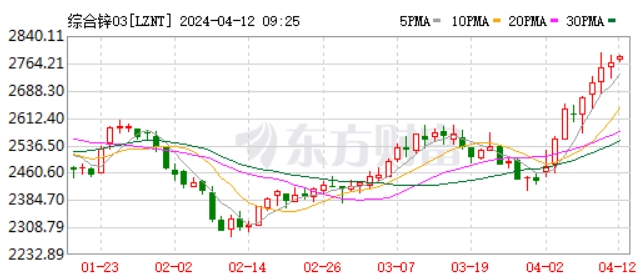 東方財富Choice終端顯示,北京時間4月12日8時左右,倫敦金屬交易所掛牌交易的綜合鋅03期貨合約(代碼:LZNT)低開高走,報價2770.50點,接近2800點大關(guān)。