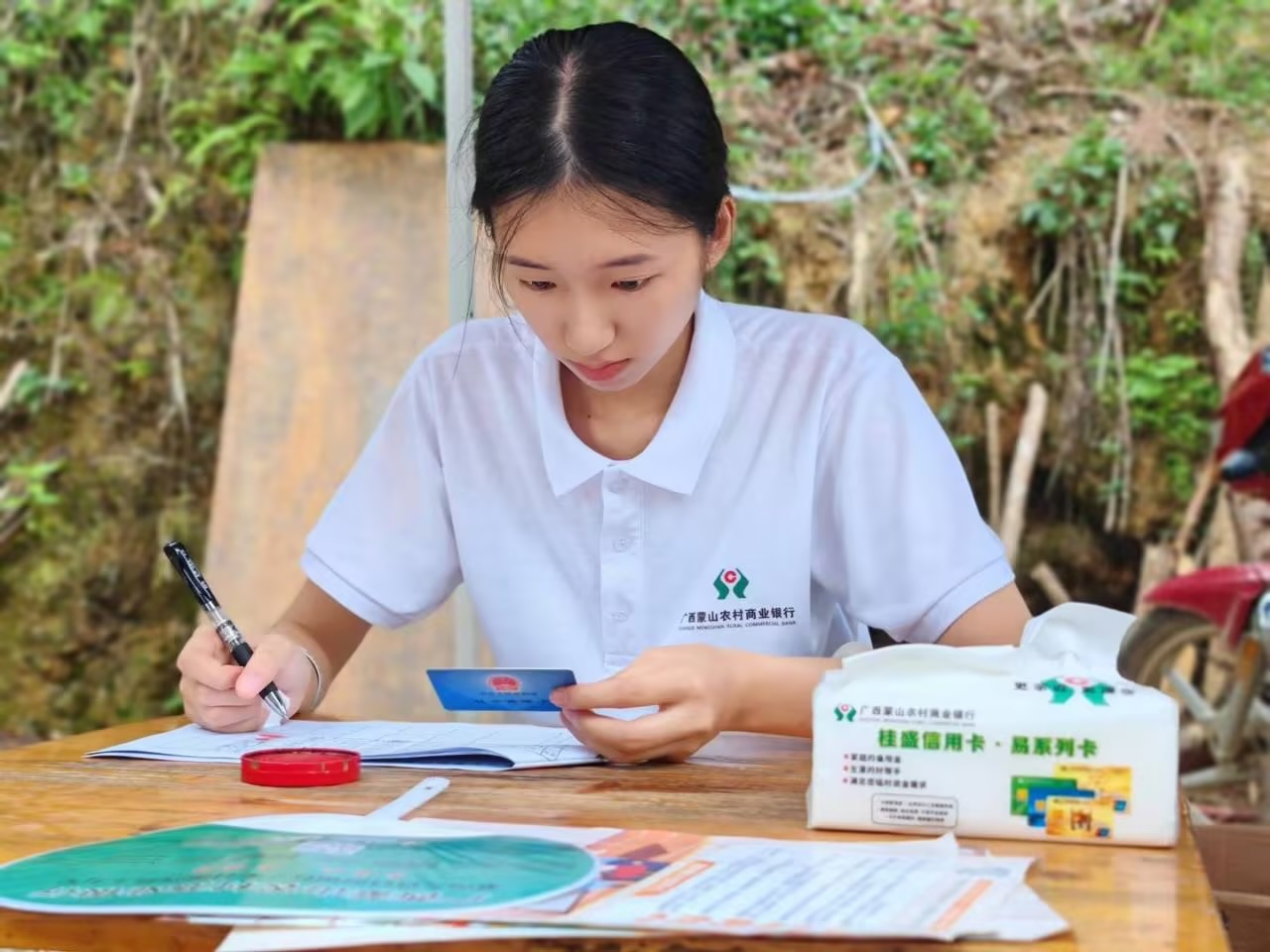 蒙山農(nóng)商銀行漢豪支行工作人員為客戶登記社保卡資料 蒙山農(nóng)商銀行供圖