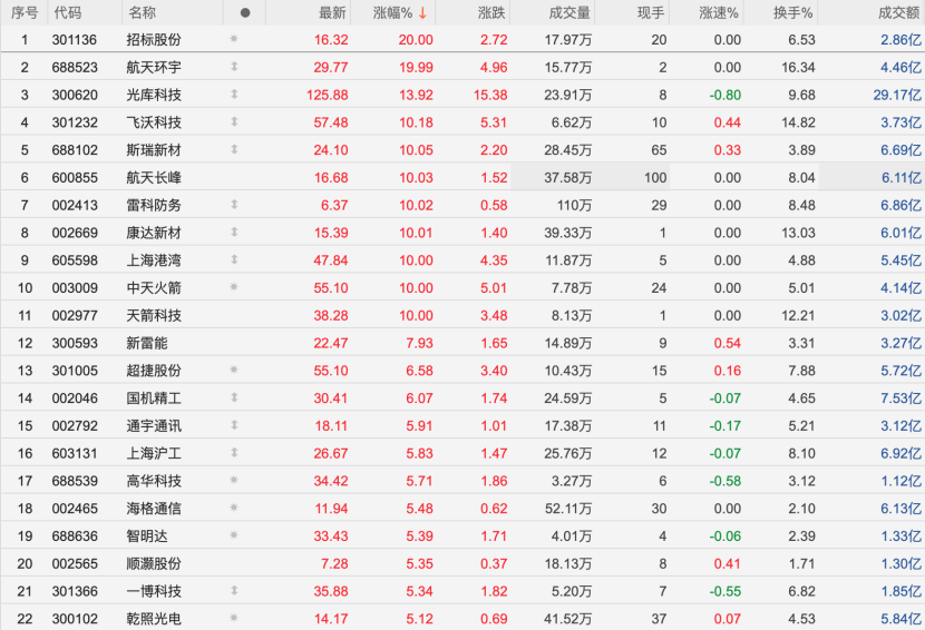 11月24日,商業(yè)航天概念板塊反復活躍,成為市場關注焦點。截至記者發(fā)稿,板塊內(nèi)多只個股強勢漲停,包括招標股份(301136.SZ)、航天環(huán)宇(688523.SH)、航天長峰(600855.SH)、雷科防務(002413.SZ)、上海港灣(605598.SH)、中天火箭(003009.SZ)、天箭科技(002977.SZ)等。同時,光庫科技(300620.SZ)、飛沃科技(301232.SZ)、斯瑞新材(688102.SH)等個股也表現(xiàn)亮眼,漲幅位居板塊前列。