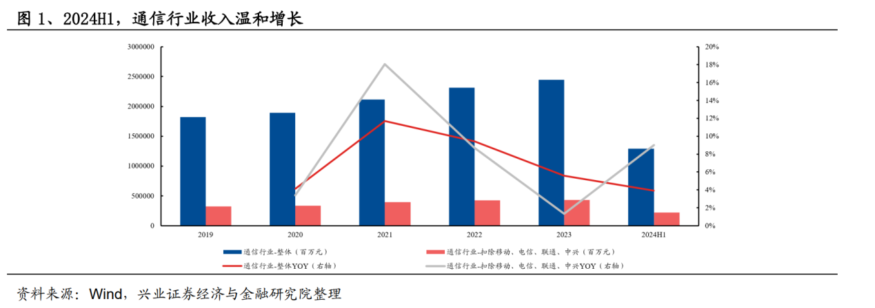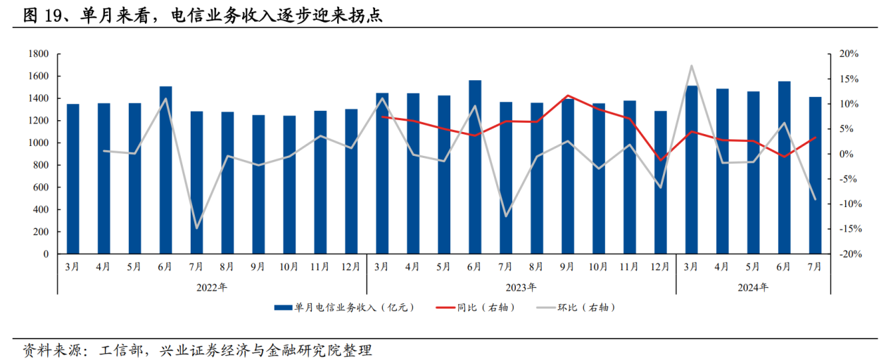 受宏觀經(jīng)濟(jì)波動(dòng)等因素影響,電信業(yè)務(wù)收入短期有所波動(dòng),展望下半年有望逐步迎來拐點(diǎn)。2024年1月份至7月份,我國電信業(yè)務(wù)收入累計(jì)完成10354億元,同比+3.0%,按照上年不變價(jià)計(jì)算的電信業(yè)務(wù)總量同比+11.2%;較去年同期相比增速有所下滑,主要系宏觀經(jīng)濟(jì)波動(dòng)下傳統(tǒng)通信業(yè)務(wù)增速或有邊際放緩。單月來看,6月電信業(yè)務(wù)收入約1554億元,同比-0.58%,增速由正轉(zhuǎn)負(fù);7月電信業(yè)務(wù)收入約1413億元,同比+3.29%,增速迎來明顯拐點(diǎn);展望全年,我國電信業(yè)務(wù)總體有望保持平穩(wěn)增長。