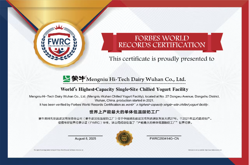 8月8日,以“蒙牛酸奶 世界品質(zhì)”為主題的FWRC福布斯世界紀(jì)錄認(rèn)證新聞發(fā)布會(huì)在蒙牛高科乳制品武漢有限責(zé)任公司(以下簡(jiǎn)稱“蒙牛低溫武漢工廠”)舉行。