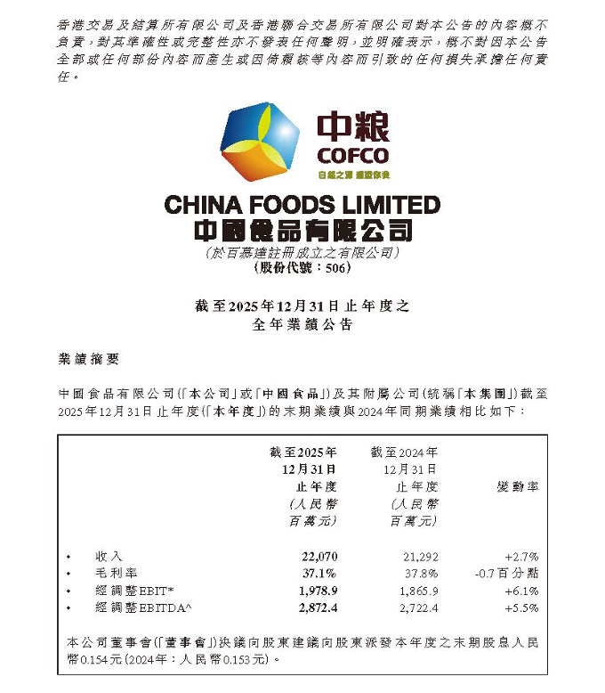 本報(bào)訊 (記者梁傲男)3月24日,中國(guó)食品有限公司(以下簡(jiǎn)稱(chēng)“中國(guó)食品”)發(fā)布的財(cái)報(bào)顯示,2025年,公司實(shí)現(xiàn)收入220.7億元,經(jīng)營(yíng)溢利19.79億元,公司高質(zhì)量發(fā)展成效顯著,持續(xù)鞏固提質(zhì)增效、穩(wěn)健向好的發(fā)展態(tài)勢(shì)。