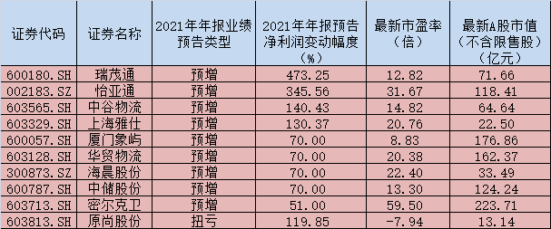 此外,物流行業(yè)喜報(bào)迭出。在已披露的2021年年報(bào)預(yù)告的13家公司中,共有12家公司業(yè)績(jī)表現(xiàn)預(yù)喜。其中,瑞茂通、怡亞通、中谷物流、上海雅仕、原尚股份等5家公司凈利潤(rùn)有望實(shí)現(xiàn)同比翻番。