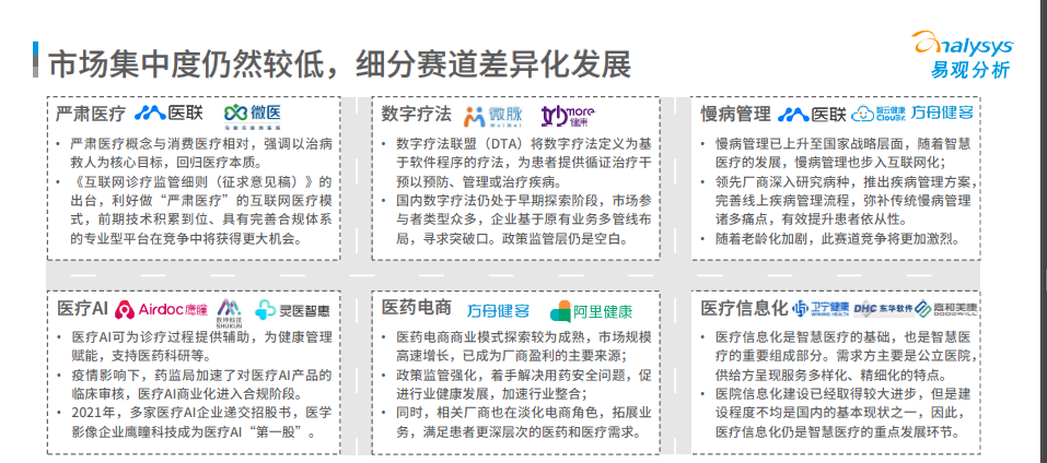 整體來看,市場集中度仍較低,行業(yè)呈多元化發(fā)展態(tài)勢,除醫(yī)藥電商外,慢病管理、醫(yī)療AI、數(shù)字療法、醫(yī)療信息化賽道均受關(guān)注程度較高。特別是自去年10月份《互聯(lián)網(wǎng)診療監(jiān)管細(xì)則(征求意見稿)》出臺之后,“嚴(yán)肅醫(yī)療”這個相對于消費醫(yī)療的概念,被頻繁提起,給出了行業(yè)發(fā)展的鮮明指向性,讓“醫(yī)歸醫(yī),藥歸藥”。報告指出,前期技術(shù)積累到位、具備完善合規(guī)體系的專業(yè)型平臺在競爭中將獲得更大機(jī)會。