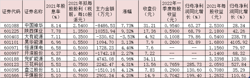 上述21家擬分紅的煤炭公司中,以4月28日收盤價計算,有18家公司2021年股息率有望超過銀行一年定存利率(1.75%)。其中,有10只個股股息率有望超5%。