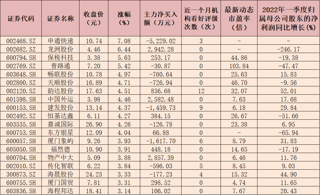 業(yè)績來看,同花順數(shù)據(jù)顯示,物流板塊內(nèi)有28家公司今年一季度歸母凈利潤實現(xiàn)同比增長,占比近六成,其中,圓通速遞、中儲股份、原尚股份、上海雅仕、東航物流等5家公司今年一季度歸母凈利潤實現(xiàn)同比翻番。