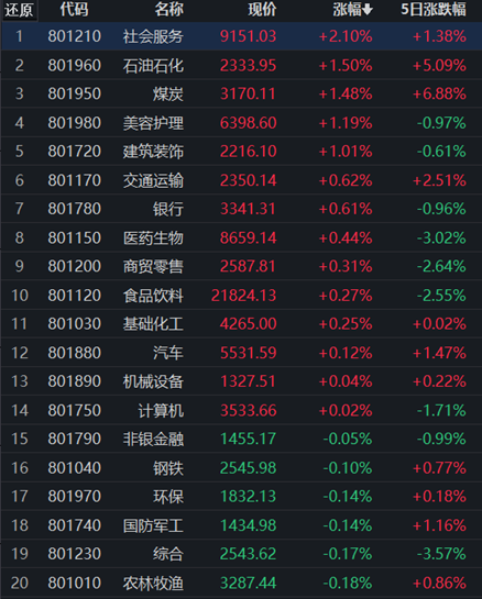 從申萬一級行業(yè)看,有14個(gè)行業(yè)上漲,社會服務(wù)行業(yè)領(lǐng)漲,漲幅達(dá)2.10%,另有包括石油石化與煤炭等在內(nèi)的四行業(yè)漲幅均在1%以上。此外,輕工制造行業(yè)跌幅居首,達(dá)0.83%。