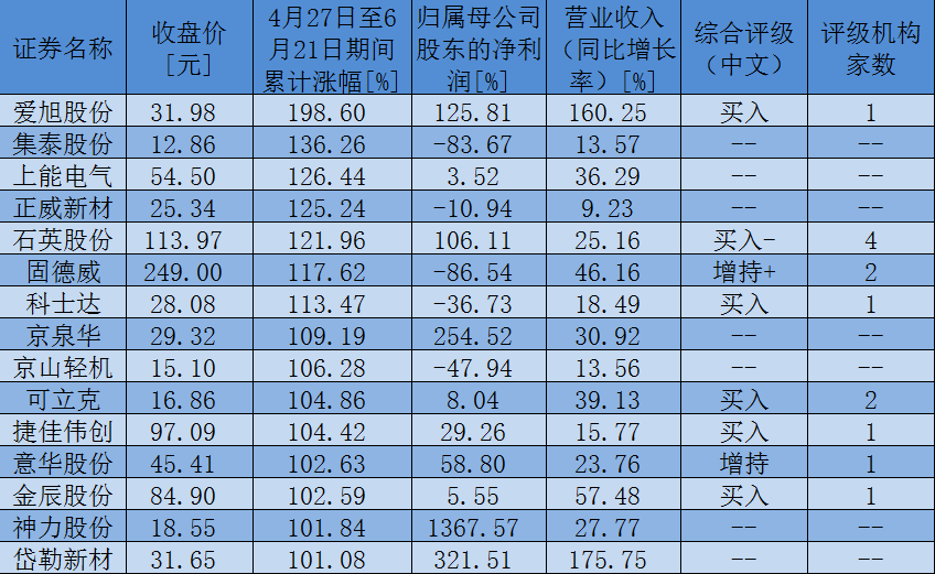 表:4月27日至6月21日,風(fēng)電和光伏概念板塊個(gè)股漲幅超100%個(gè)股一覽