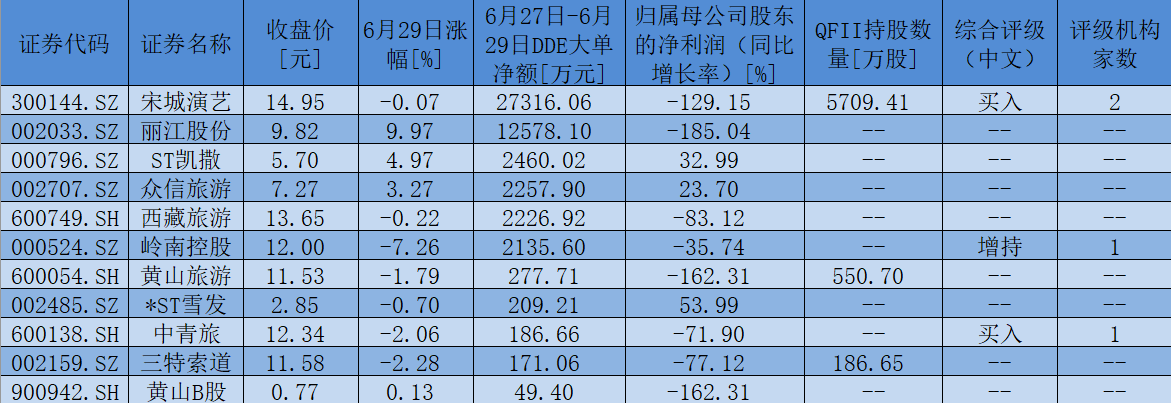 表:6月27日-6月29日,景點(diǎn)及旅游板塊呈現(xiàn)大單資金凈流入個(gè)股一覽