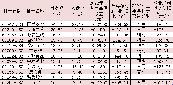 表:7月份以來漲幅超10%的農(nóng)林牧漁股一覽